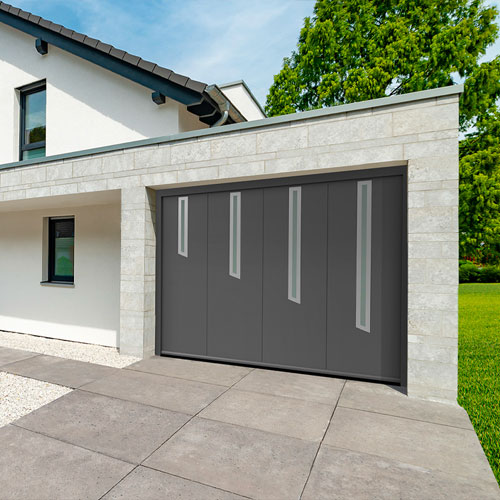 La porte latérale est parfaite lorsque le plafond du garage n’est pas libre ou qu’il est utilisé pour du rangement. Elle coulisse sur le côté avec un refoulement à gauche, à droite ou double.